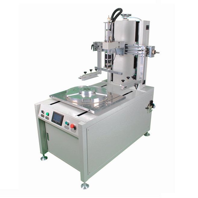 針對(duì)印刷面下凹的圓盤形產(chǎn)品,普通的絲印機(jī)平移運(yùn)動(dòng)的刮刀無法完成印刷。
